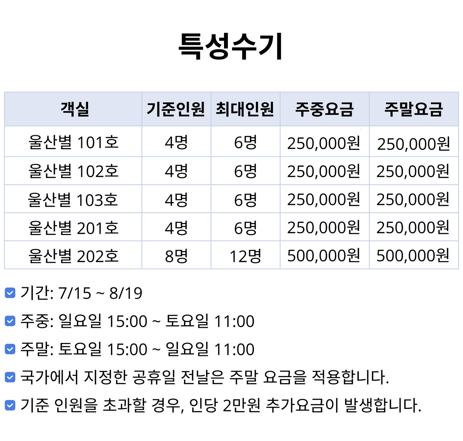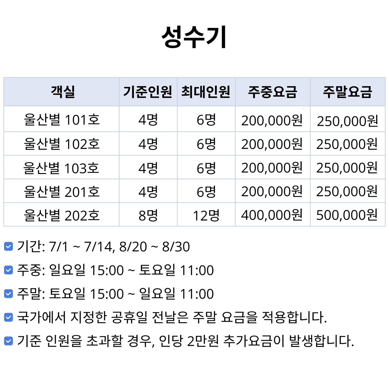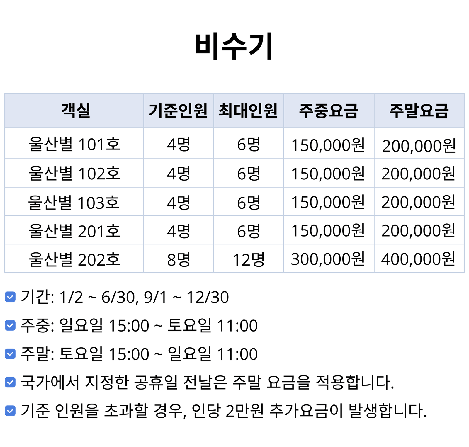 인원: 기준 4명 / 최대 6명 (기준 인원 초과 1인당 2만원, 영유아 포함)