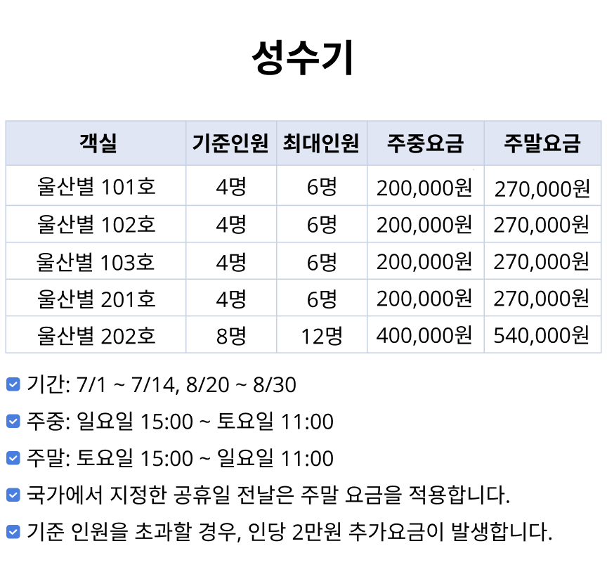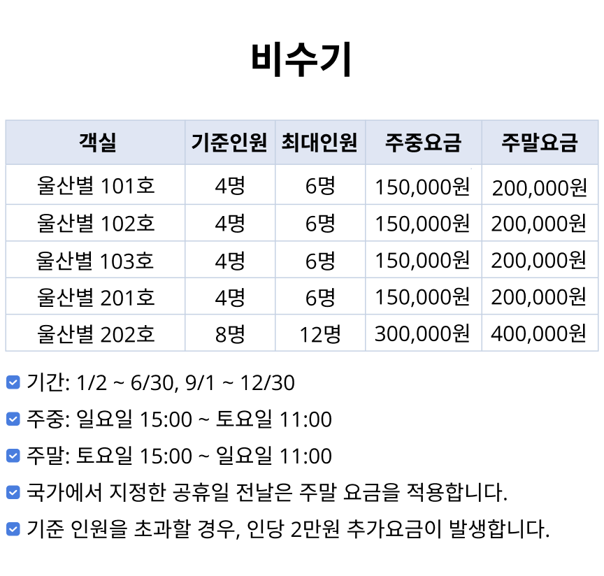 인원: 기준 8명 / 최대 12명 (기준 인원 초과 1인당 2만원, 영유아 포함)